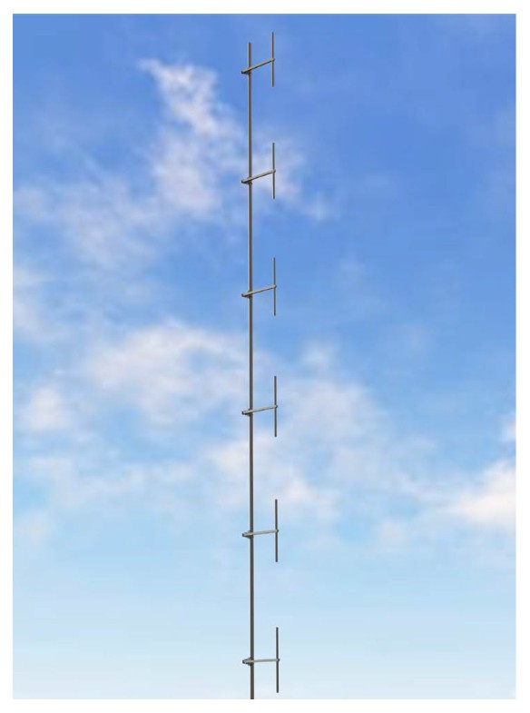 Dipole antenna, ADE0102222, Vertical polarization, Broadband 87.5 - 108 MHz, Omnidirectional radiation pattern, Hot dip galvanized steel, EIA 7/8”, 5000W max RMS, Made in Italy 🇮🇹.