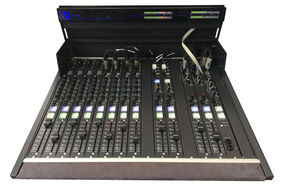 Professional Modular Broadcast mixer FRAME 16-12 Channel, 4 Micro/Line input modules with equalization, 4 Line/Line input modules with equalization, 2 Telephone Hybrid with equalization & echo canc. Talkback, Out: Master, 2 X SUB, REC, Monitor, EXTERNAL 1 RU POWER SUPPLY.